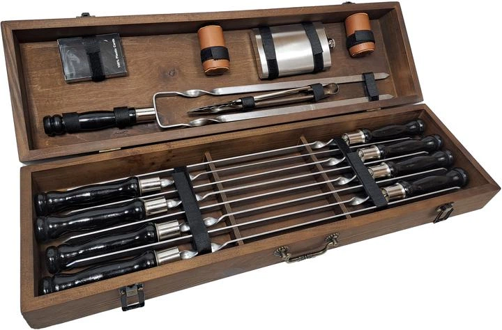 Подарунковий набір шампурів для пікніка, ручна робота, з дерев'яною ручкою, 16 предметів у дерев'яній валізі