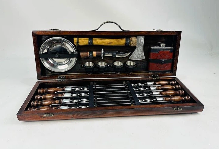 Набір шампурів ручної роботи Пікнік люкс з нержавіючої сталі з дерев'яними ручками в дерев'яному кейсі (33-89-НШ-ПЛ31)
