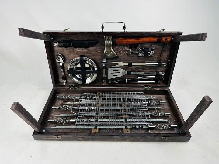 Подарунковий набір шампурів і аксесуарів Bbq Ексклюзив з полірованого металу в дерев'яному кейсі-трансформері 31 предмет Кор