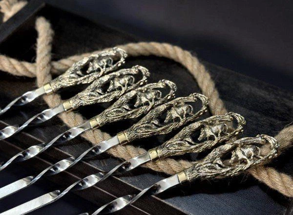Подарунковий набір шампурів у дерев'яному кейсі САФАРІ 2 латунні голови звірів ручна робота 11 предметів нержавіюча сталь (8