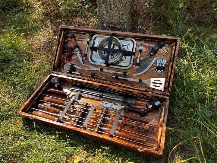 Подарунковий набір KS-7511 у дерев'яному кейсі Мега ручної роботи шампура та аксесуари для пікніка 38 предметів (80-10-KS-75