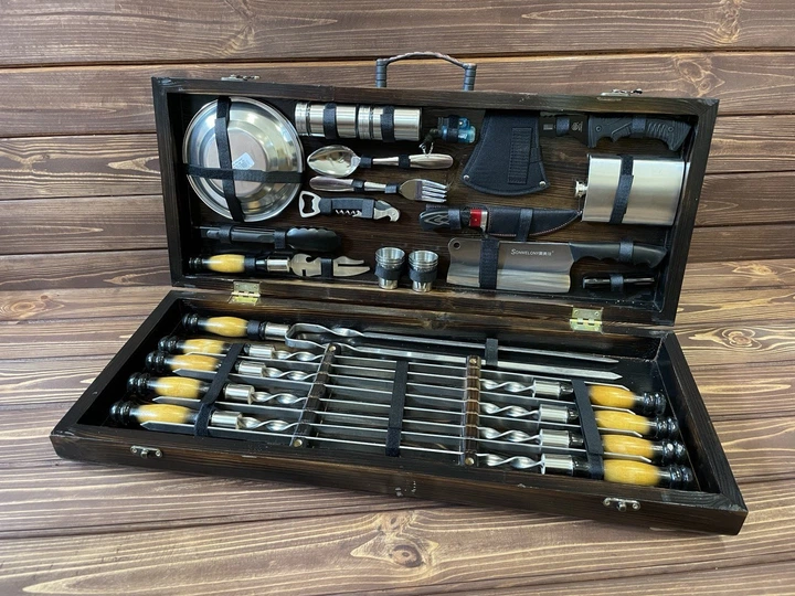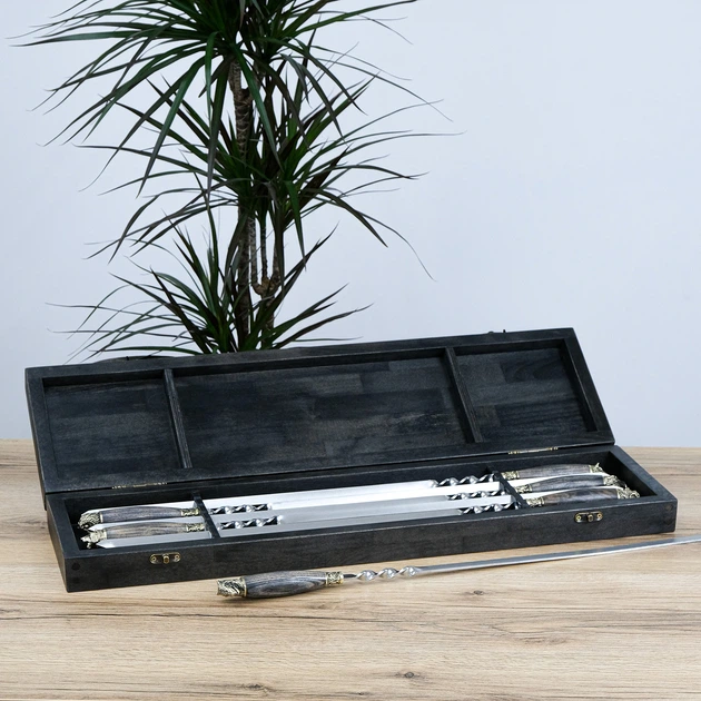 Набір із 8 шампурів для м'яса та люлюля-кебаб "Master" (730х15х3 мм) + комплект аксесуарів у дерев'яному кейсі Ш5