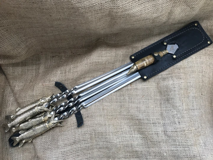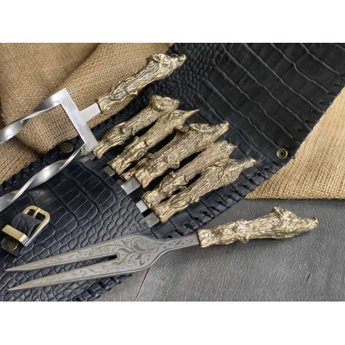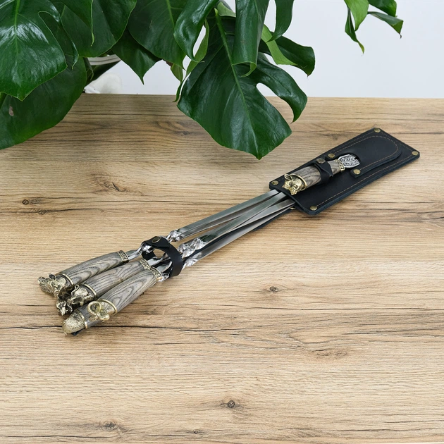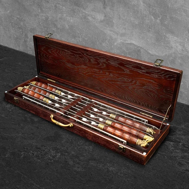 Набір шампурів Геркулес з нержавіючої сталі з дерев'яними ручками ручної роботи в дерев'яному кейсі (33-89-НШ-ГЛ 88)