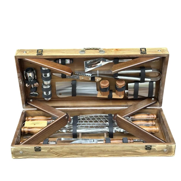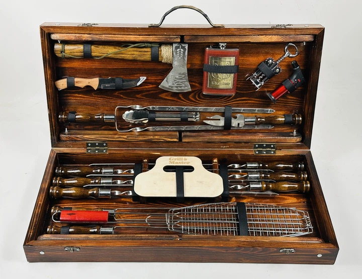 Набір шампурів с аксесуарами Мастер Гриль в дерев'яному кейсі із нержавіючої сталі на 28 предметів Світле дерево (14-17-1191