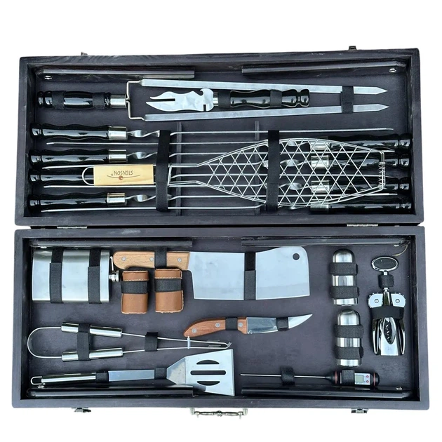 Набір шампурів і аксесуарів Мастер Гриль в дерев'яному кейсі з нержавіючої сталі на 28 предметів Чорне дерево (14-17-1191610