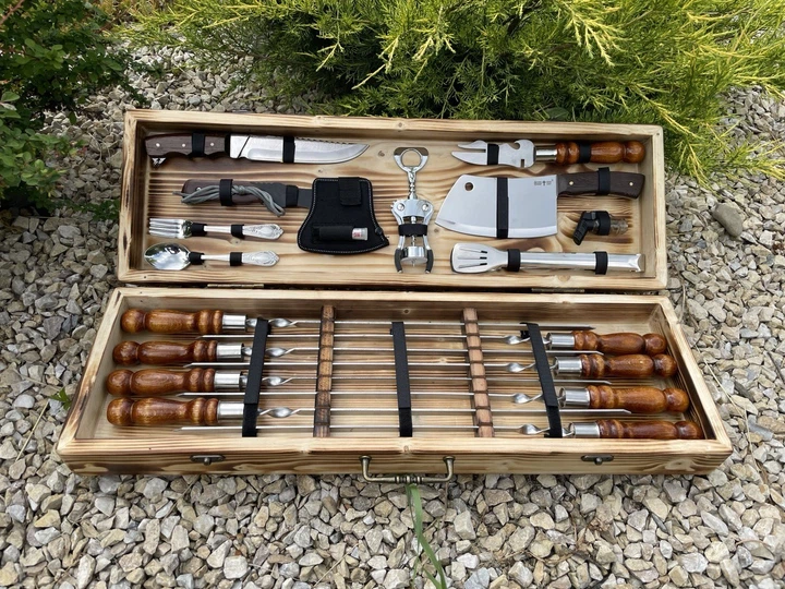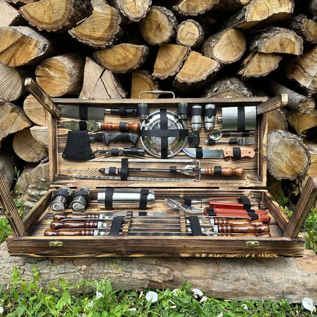 Набір шампурів у дерев'яному кейсі-столі Вовк МАХ 75x35x13 см 23 предмета з нержавіючої сталі ручна робота (125-10-KS-7301)