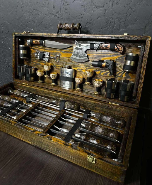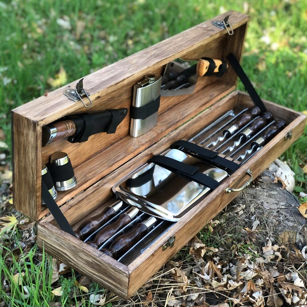 Подарунковий набір шампурів КАБАН ручна робота, повний туристичний набір, з підставкою в дерев'яній валізі