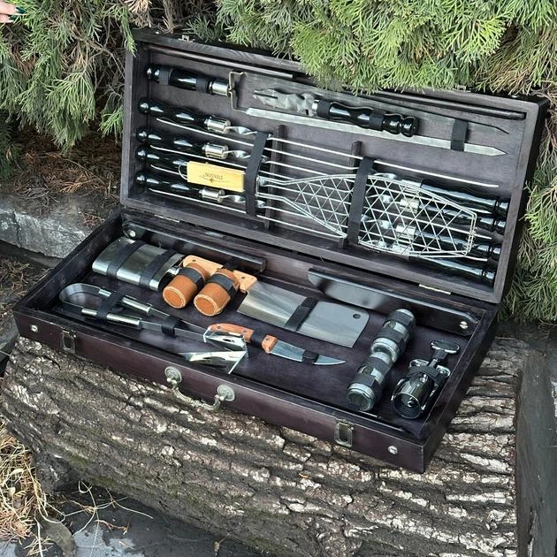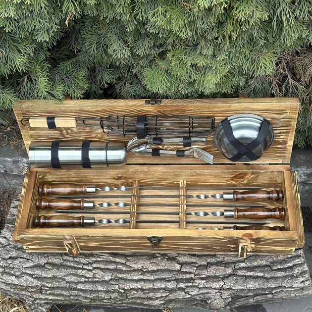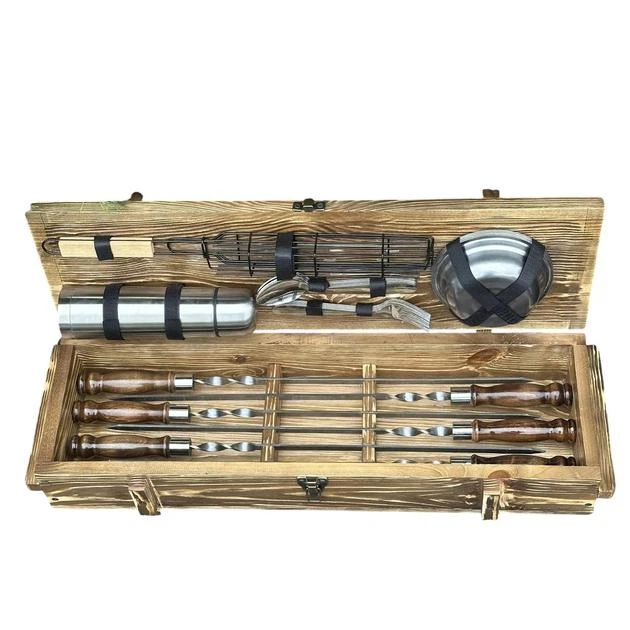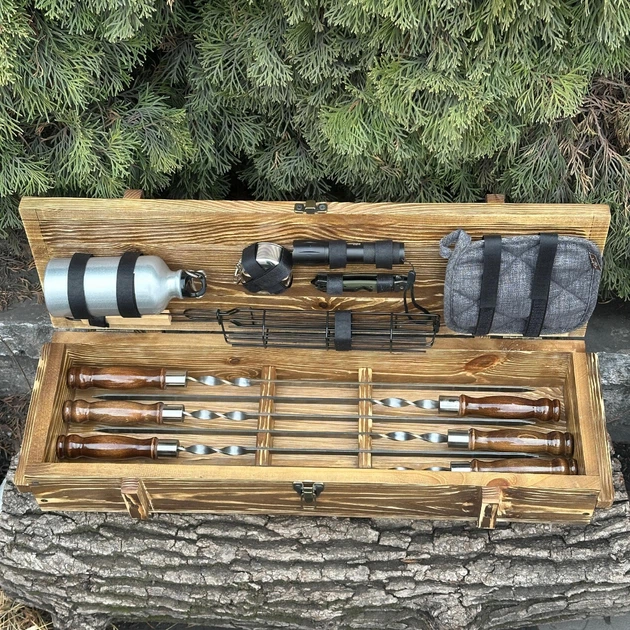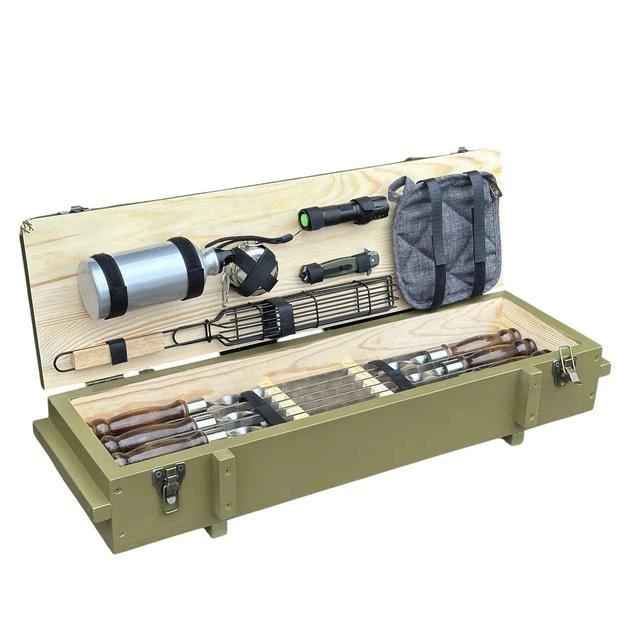Набір шампурів та аксесуарів Мілітарі в дерев'яному кейсі з нержавіючої сталі на 14 предметів
