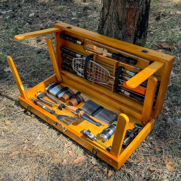 Набір шампурів із аксесуарами Комбат у дерев'яному кейсі із нержавіючої сталі на 27 предметів Світле дерево