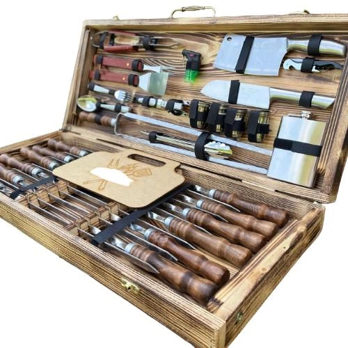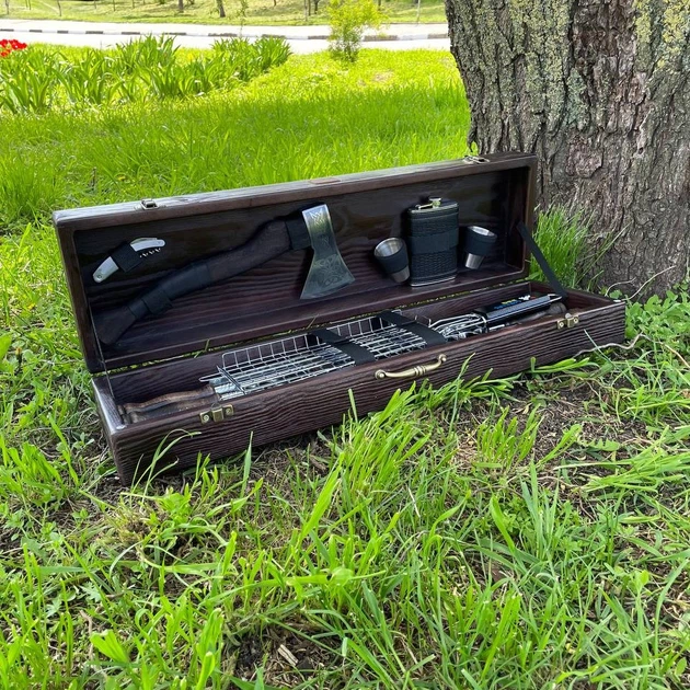 Подарунковий набір шампурів для чоловіка ПАНТЕРА 17 предметів у зручному дерев'яному кейсі, сокира, фляга з чарками, мангал-