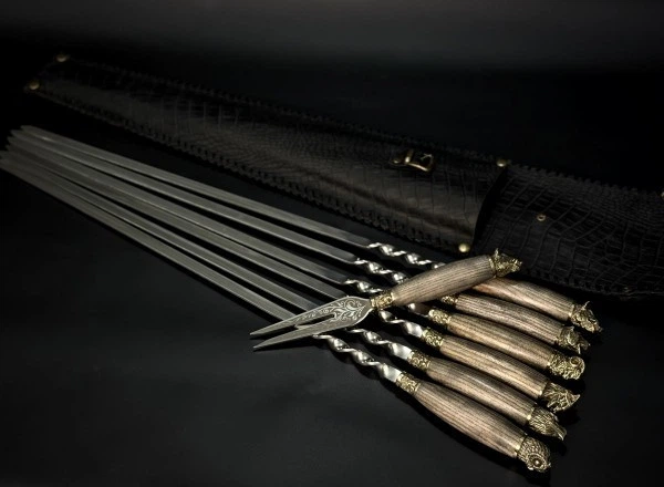 Набір із 8 шампурів з кованою ручкою "Вікінг" (700х12х3 мм) + подвійний шампур + комплект, в дерев'яному кейсі