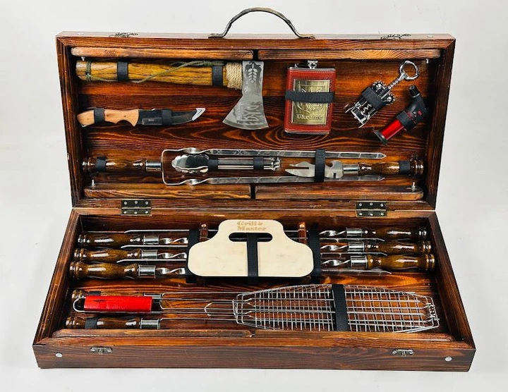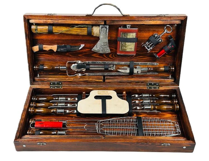 Подарунковий набір шампурів та аксесуарів Гетьман із нержавіючої сталі в дерев'яному кейсі-столі на 18 предметів Коричневий