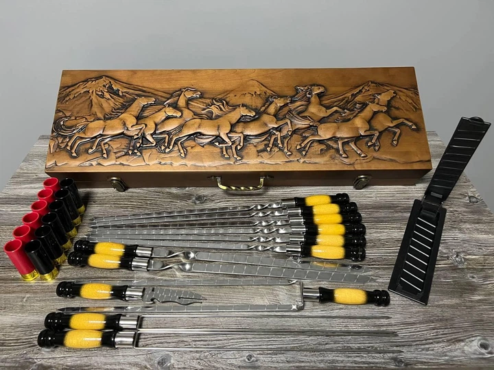Набір шампурів у кейсі з дерева для шашлику Коні 56х89 см