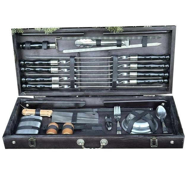 Подарунковий набір шампурів для чоловіка БІЗОН у дерев'яній валізі, набір для барбекю