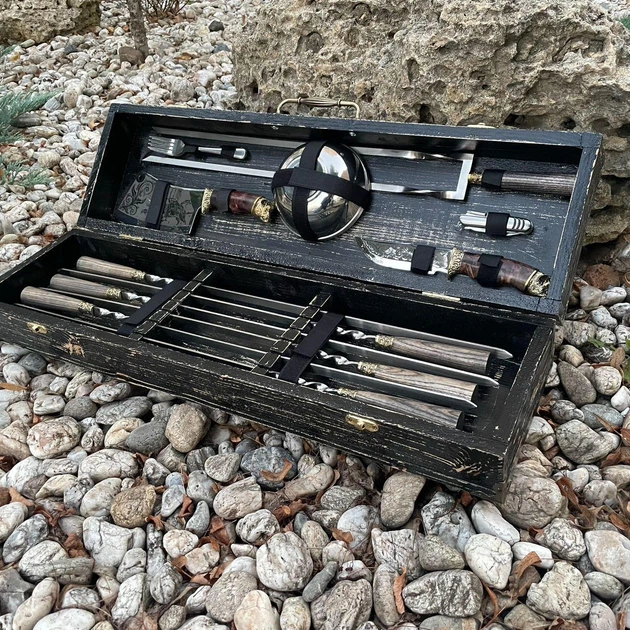 Набір шампурів ручної роботи 6 шт у дерев'яному кейсі, великий подарунковий набір шампурів 31 предметів NP-23