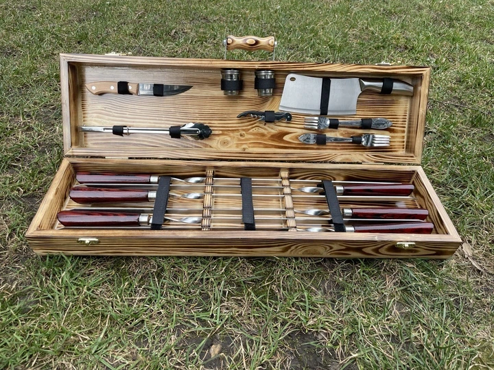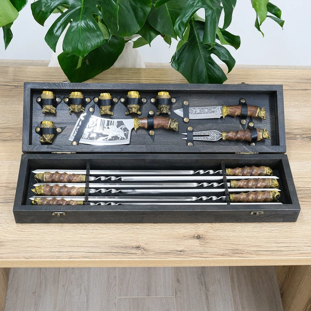 Елітний подарунковий набір шампурів та барбекю-аксесуарів із чарками у дерев'яному кейсі. Гранд Презент