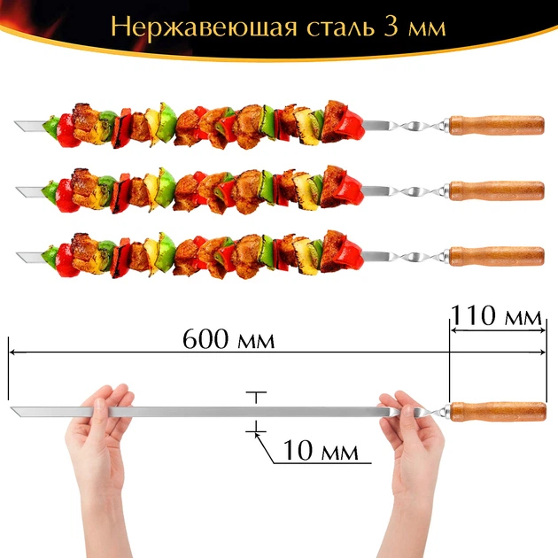 Шампур 600/10/3мм нержавеющая сталь деревянная ручка Ручная работа EcoGrill