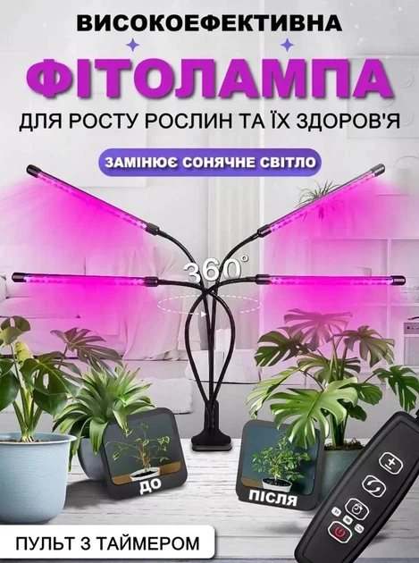 Фітолампа для росту рослин 3 режими освітлення на прищепці для кімнатних квітів, розсади, орхідей на 4 лампи