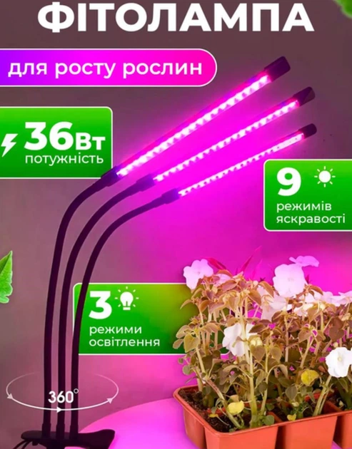 Фітолампа для росту рослин 3 режими освітлення на прищепці для кімнатних квітів, розсади, орхідей на 3 лампи
