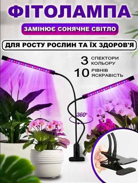 Фітолампа для росту рослин 3 режими освітлення на прищепці для кімнатних квітів, розсади, орхідей на 2 лампи