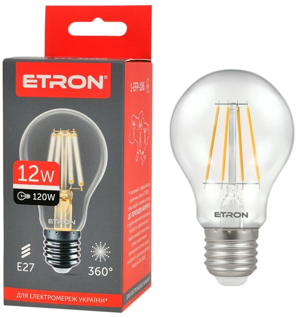 Світлодіодна філаментна лампа ETRON 12W A60 E27 4200K нейтральне світло, прозора, енергозберігаюча