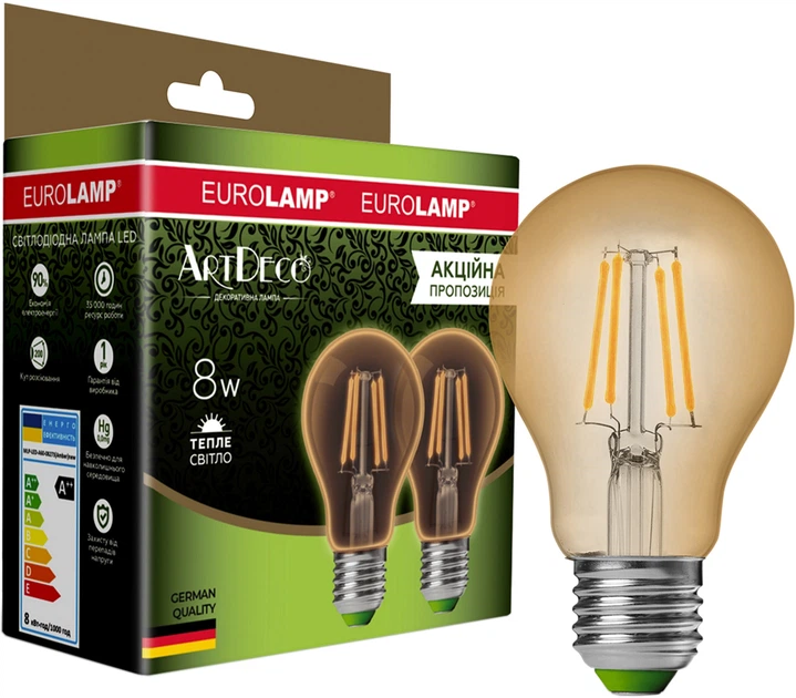 Філаментна лампа EUROLAMP LED А60 800 Lm E27 3000K 2шт
