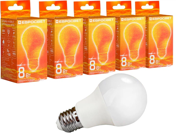 Світлодіодна лампа Євросвітло LED 8 Вт 4200К A-8-4200-27 Е27 5 шт (2100011891296)