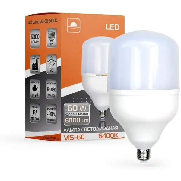 Лампа світлодіодна високопотужна Євросвітло 60Вт 6400К (VIS-60-E27) (40892) Акція!