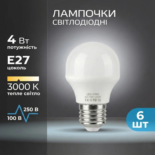 Комплект світлодіодних LED ламп E27 4W 3000K тепле світло, 400 Lm, 6 штук