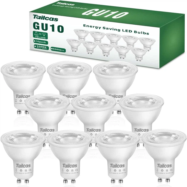 Світлодіодні лампи Tailcas GU10, 7 Вт галогенний еквівалент 50 Вт, упаковка 10 шт, Теплий білий, Білий