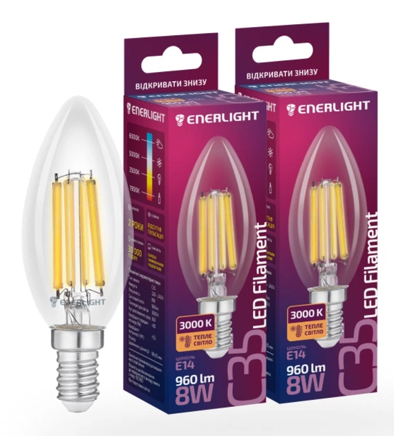 Світлодіодна лампа ENERLIGHT Filament С35 8Вт 3000К Е14 2 шт