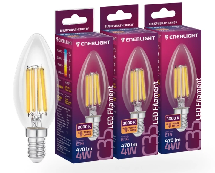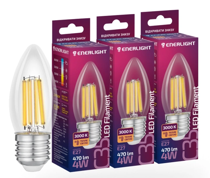 Світлодіодна лампа ENERLIGHT Filament С35 4Вт 3000К Е27 3 шт
