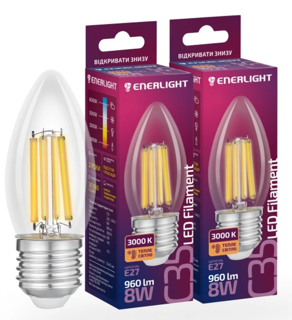 Світлодіодна лампа ENERLIGHT Filament С35 8Вт 3000К Е27 2 шт