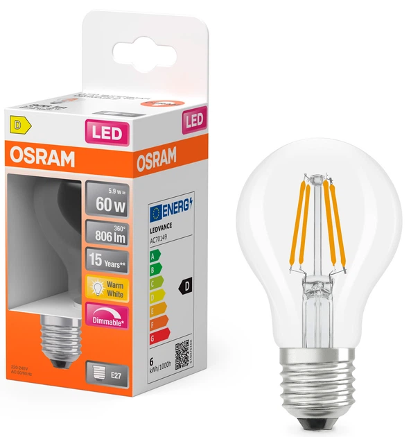 Світлодіодна лампа OSRAM Filament A100 DIM 5,9W 806Lm 2700K E27 (4099854465055)