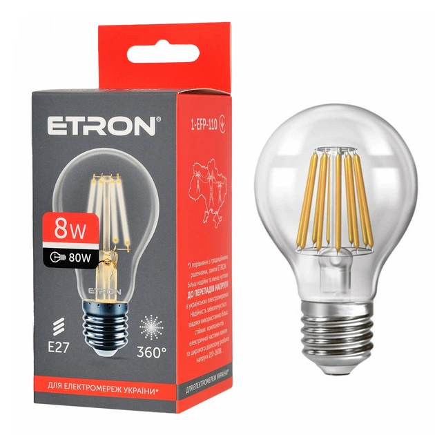 Світлодіодна філаментна лампа ETRON Filament 8W A60 E27 4200K прозора
