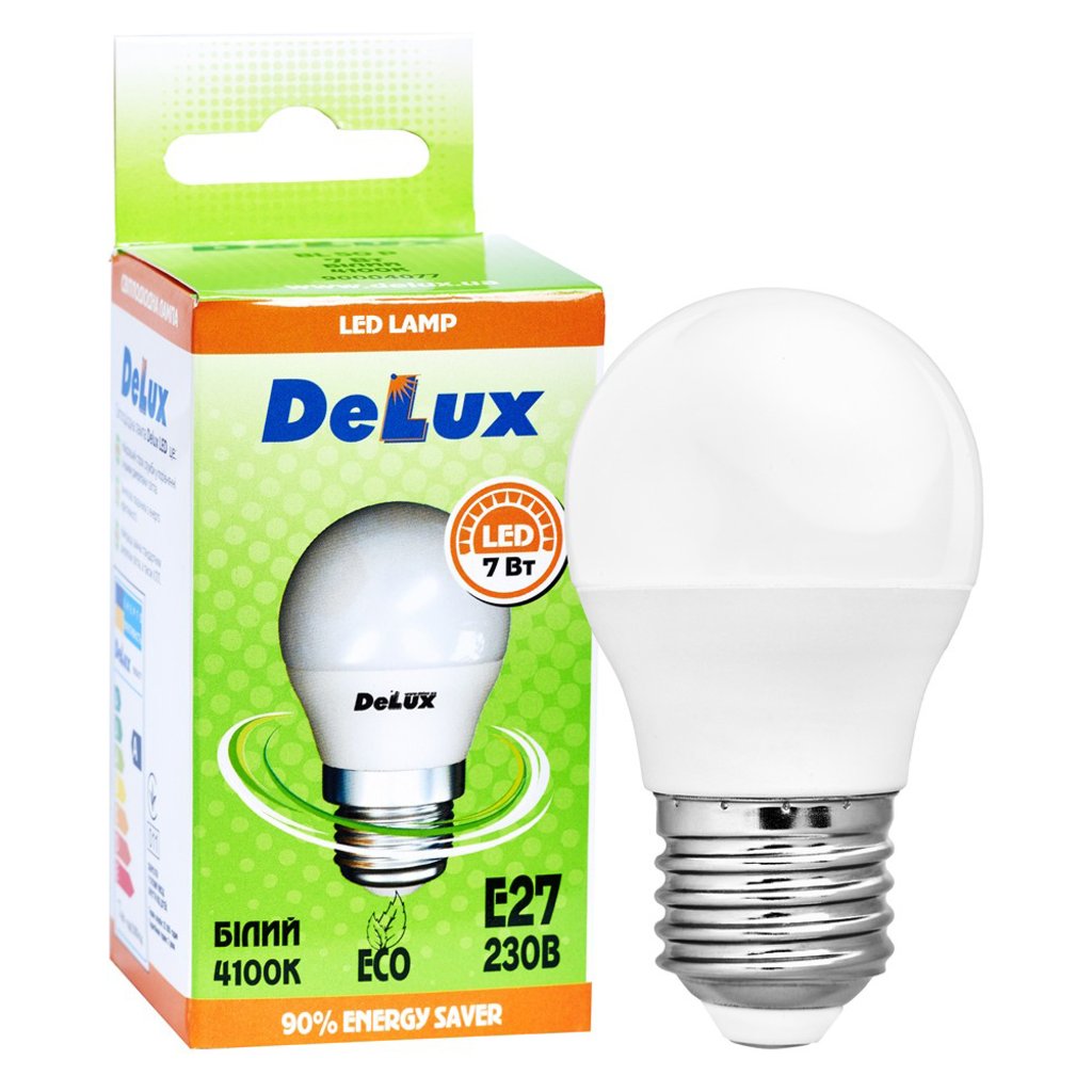 Бренд: Delux; Яскравість світлового потоку, (Люмени): 630; Колір колби: Матовий; Країна-виробник: Китай; Напруга, В: 220; Потужність, Вт: 7; Регулятор яскравості: Ні; Цоколь: Е14; Тип колби: Сферична