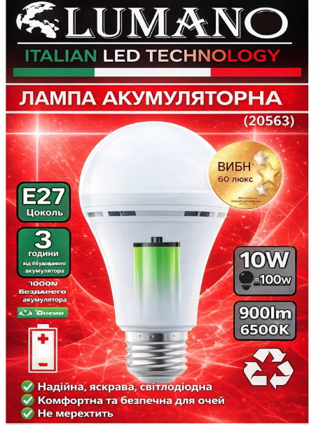 Лампа акумуляторна LED Emergency A60-10W 6000К Е27 (20563) гарантія 12міс TM LUMANO