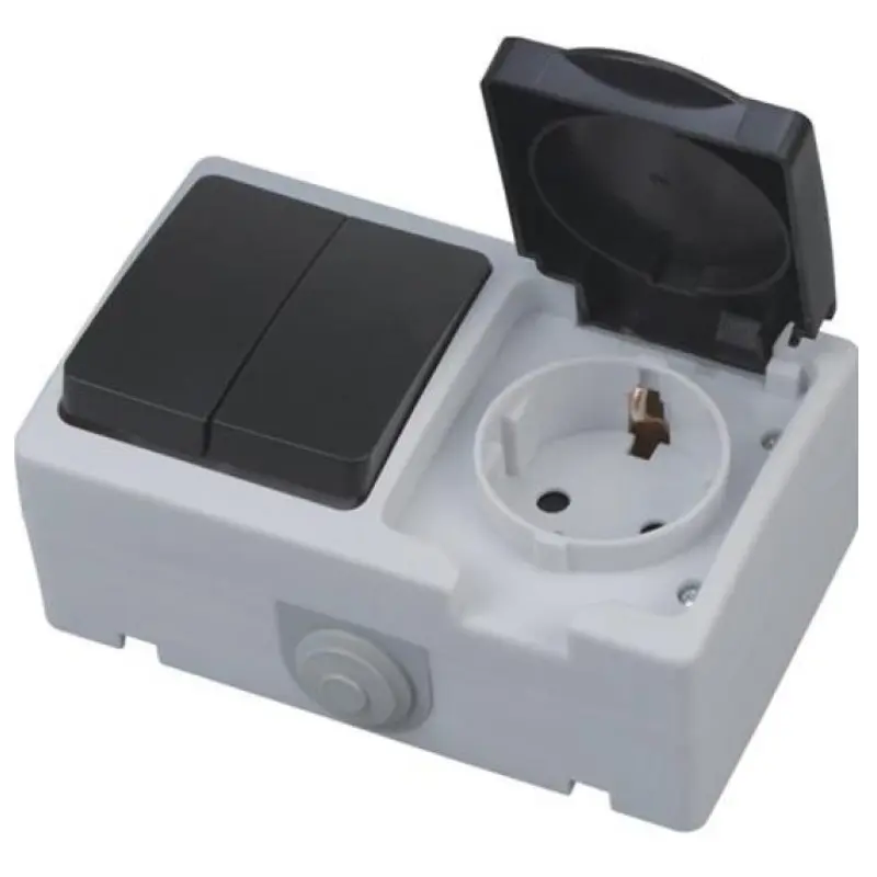 Розетка Horoz Electric Atom, 1-на накладна із заземленням, з кришкою, з 2-м вимикачем, чорно-сіра