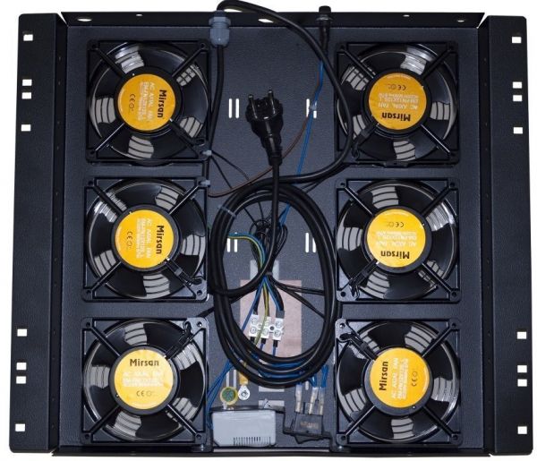 Особливості Блок вентиляторів MIRSAN 1U призначений для примусового охолодження обладнання в 19-дюймових шафах, де природної конвекції недостатньо через щільне розміщення пристроїв або високе тепловиділення. Вбудований аналоговий термостат автоматично вмикає вентилятор при досягненні заданої температури всередині шафи, що дозволяє підтримувати стабільний тепловий режим без