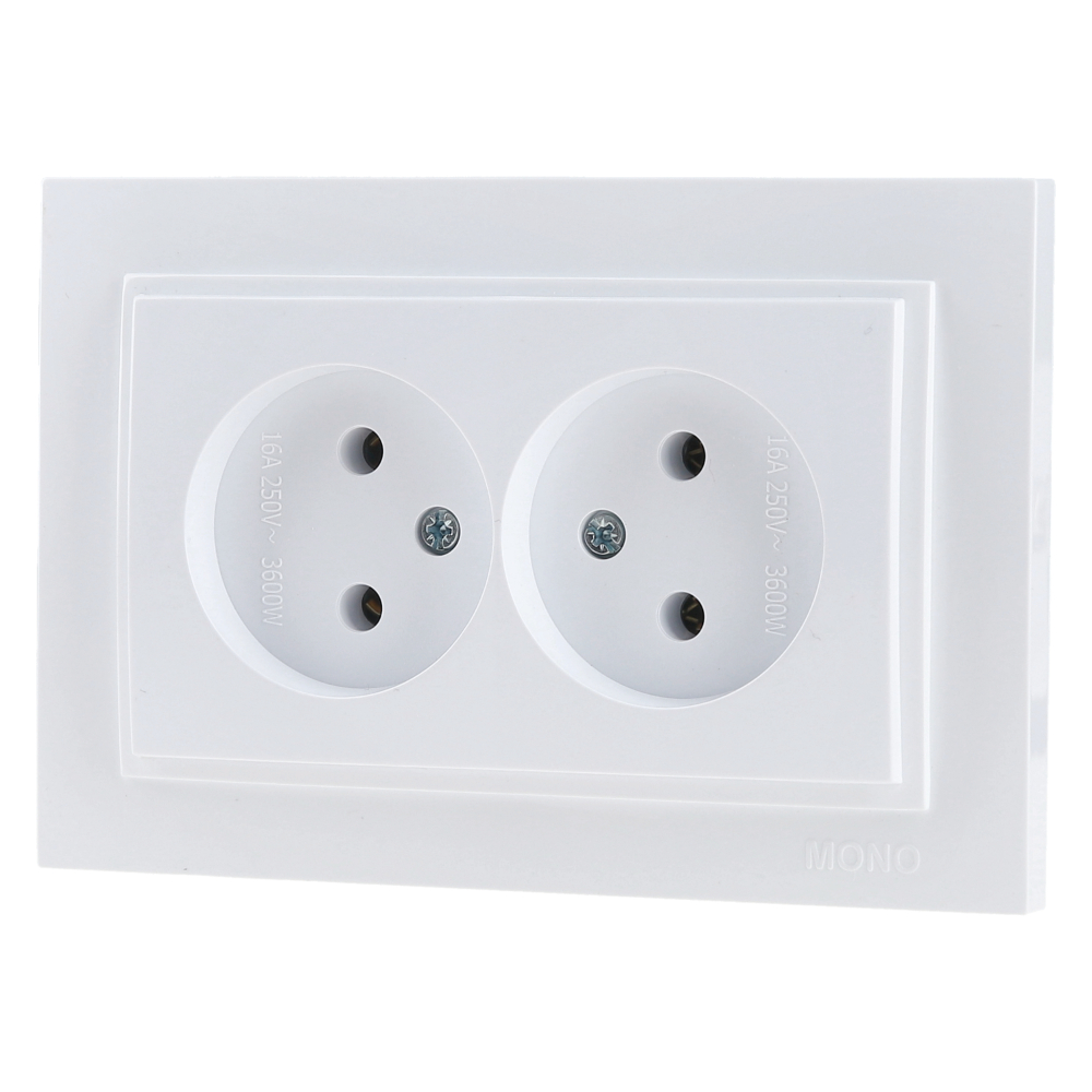 Тип виробу: Розетка; Тип розетки: Подвійна,Без заземлення; Кількість постів / модулів: 2 пости; Вологозахист (IP): IP20; Вхідна напруга, В: 220–250; Комплектація: Повний комплект (механізм + рамка + клавиша/накладка); Бренд: Mono Electric; Глибина, мм: 46; Колір: Білий, сірий; Країна реєстрації бренду: Туреччина; Країна виробництва: Туреччина; Матеріал: ABS пластик; Монтаж: Прихований (вбудований); Номінальна потужність, Вт: 3680; Серія: Despina; Ширина, мм: 127; Сила струму, А: 16