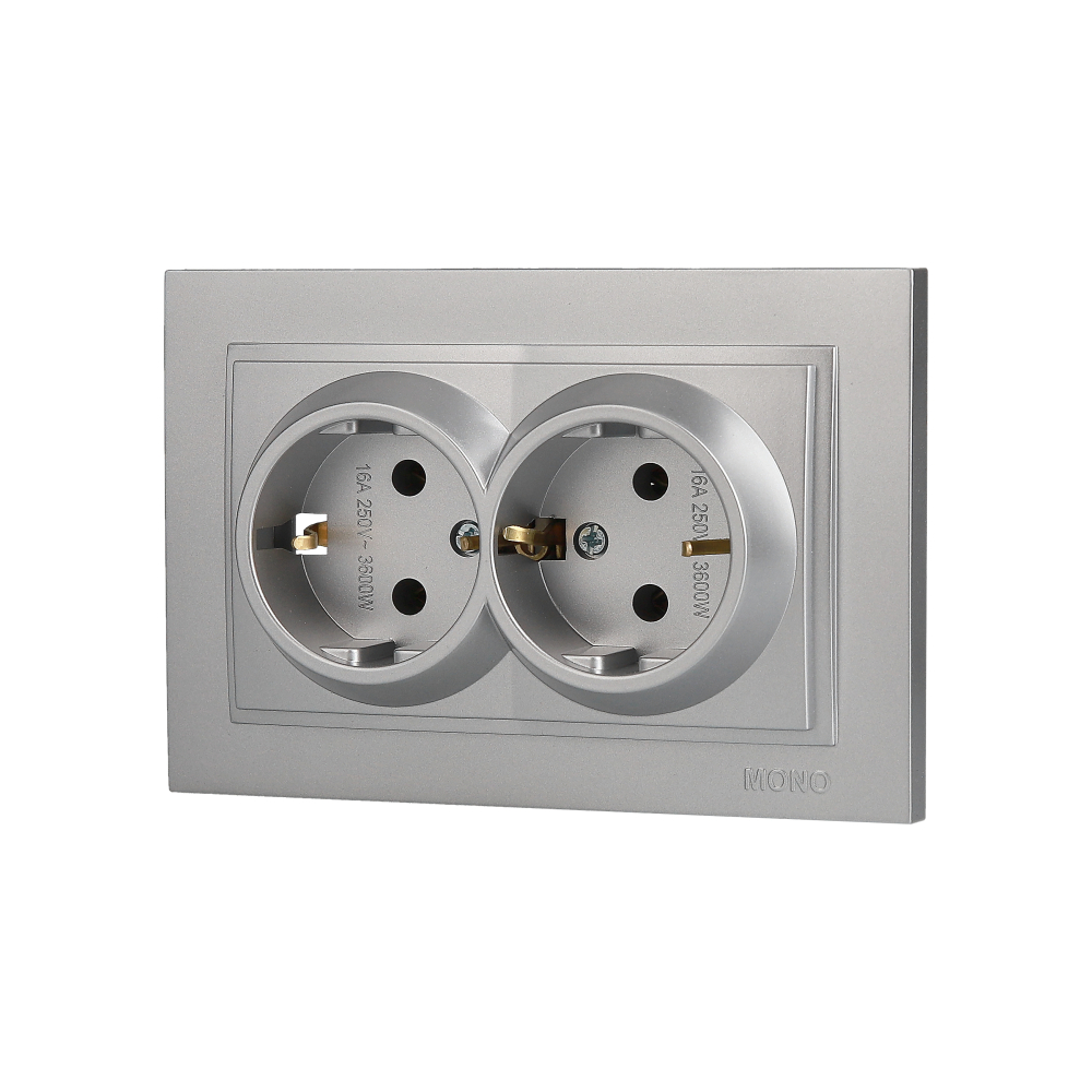 Тип виробу: Розетка; Тип розетки: Подвійна,З заземленням; Кількість постів / модулів: 2 пости; Вологозахист (IP): IP20; Вхідна напруга, В: 220–250; Комплектація: Повний комплект (механізм + рамка + клавиша/накладка); Бренд: Mono Electric; Глибина, мм: 50; Колір: Срібло; Країна реєстрації бренду: Туреччина; Країна виробництва: Туреччина; Матеріал: ABS пластик; Монтаж: Прихований (вбудований); Номінальна потужність, Вт: 3680; Серія: Despina; Ширина, мм: 127; Сила струму, А: 16
