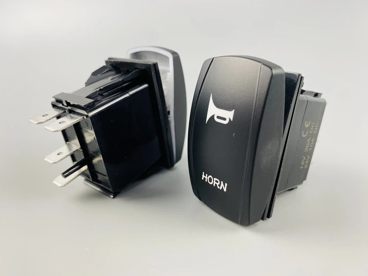 Клавіша вимикач ON-OFF-ON, 4 ніжки, синя підсвітка, малюнок — "сигнал додатковий".