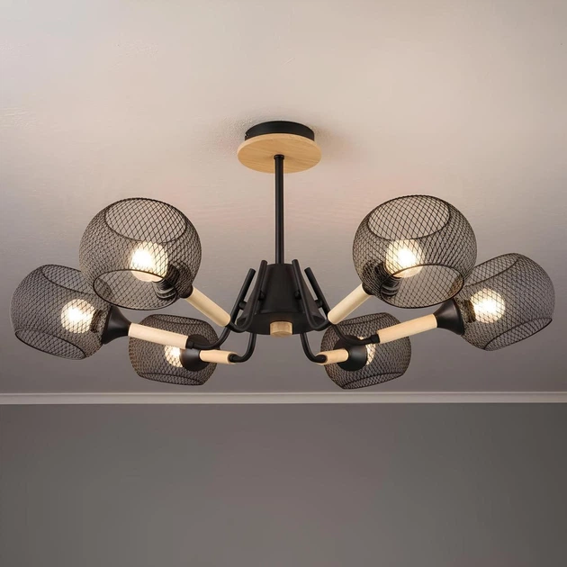 Стельова люстра Valeso N6620/6 з шістьма сітчастими плафонами під лампи E27 корпус чорний метал з елементами дерева