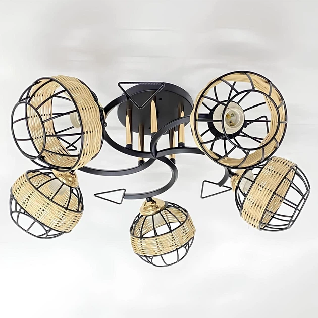 Люстра стельова VALESO 91179A/5 з п'ятьма плафонами з металу та ротанга під лампи Е27 корпус чорний із золотом