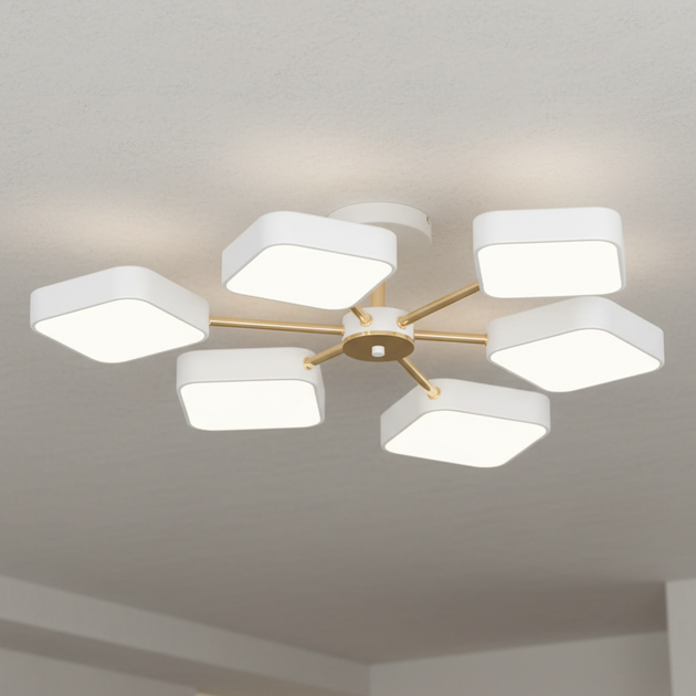 Стельова світлодіодна люстра 108W Valeso XI3351-6 із шістьма квадратними плафонами 3000/4200/6000K у біло-золотому кольорі.