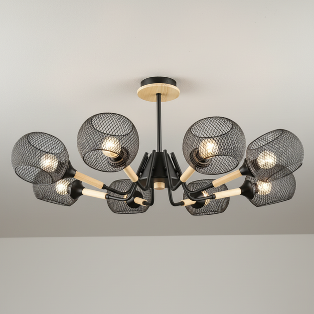Стельова люстра в лофт стилі Valeso N6620/8 з металевими чорними плафонами в сітку на 8 ламп E27 каркас чорний з деревом