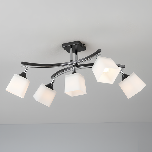 Стельова люстра Valeso B N1435/5 BK+CH з п'ятьма регульованими білими плафонами зі скла під лампи Е27 чорно-хромовий каркас