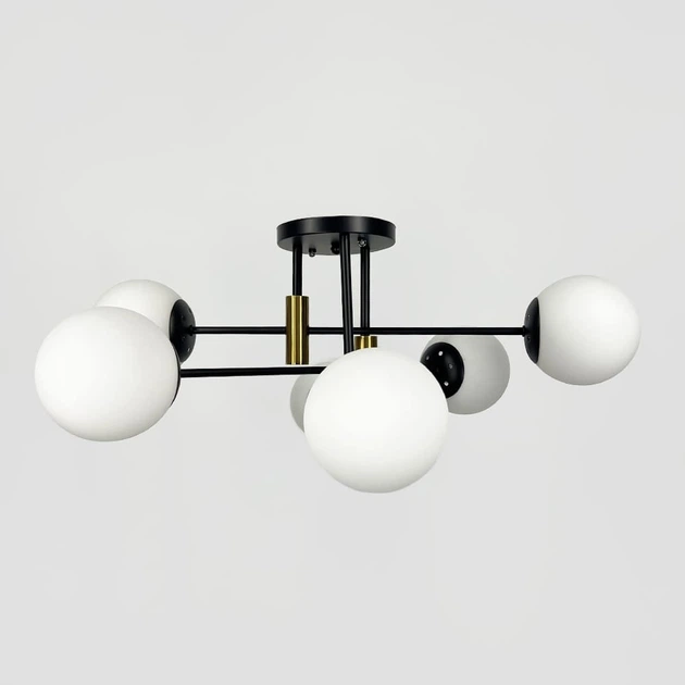 Стельова чорна люстра з латунною фурнітурою на 6 білих плафонів 65 см