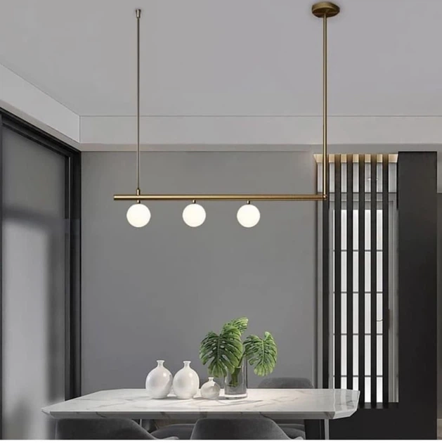 Латунний підвісний світильник у подовженому корпусі 53 см із 3 білими плафонами | Line F | Арт. C167/3 AB