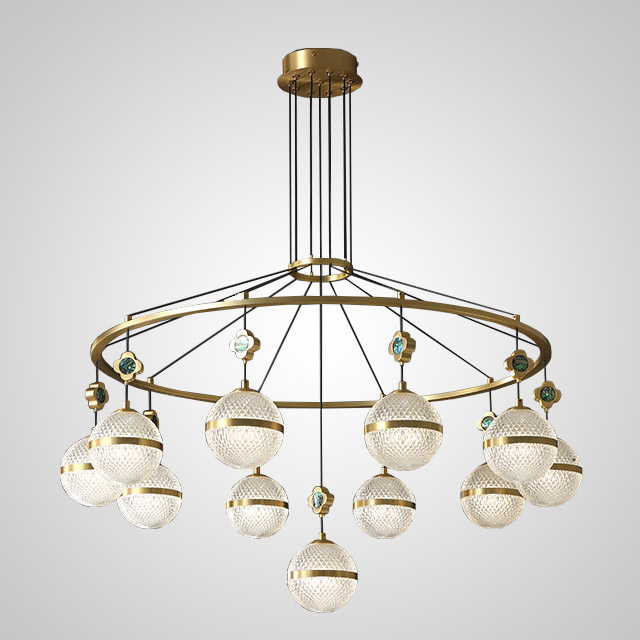 Підвісна люстра PARIS L125 від бренду DEPRIMO поєднує ретро і сучасний стиль, доповнений елементами флористики. Люстру відрізняє вишукана латунна арматура та прозорі скляні плафони, що створюють ефектне освітлення у приміщенні. Світильник має ширину 450 мм та висоту 300 мм, а його довжина становить 1250 мм. Він підходить для прикраси різних інтер'єрів, таких як вітальня, готель, шоу-рум та